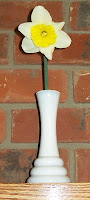 After a few days of teasingly warm temperatures, followed by another cold and dreary weekend, it looks like spring truly may be just around the corner. Our yard doesn't get enough sun to grow many flowers, but I did (past tense) have one lone jonquil springing up. It looked so sad all by itself that I picked it and brought it inside. Since its little head was hanging down, I put it up on the shelf over the fireplace so that it could smile down at us. And up there, the cat won't eat it.